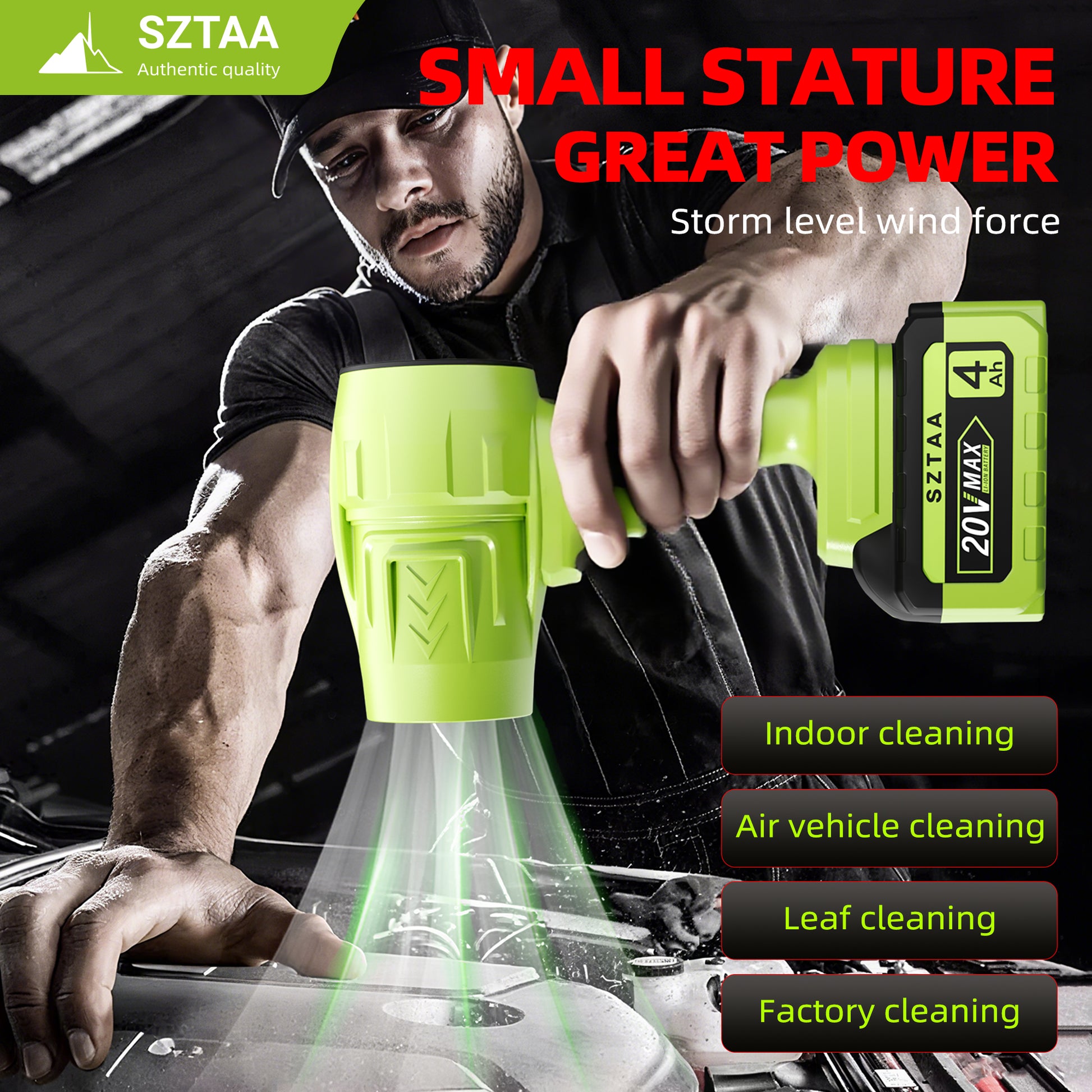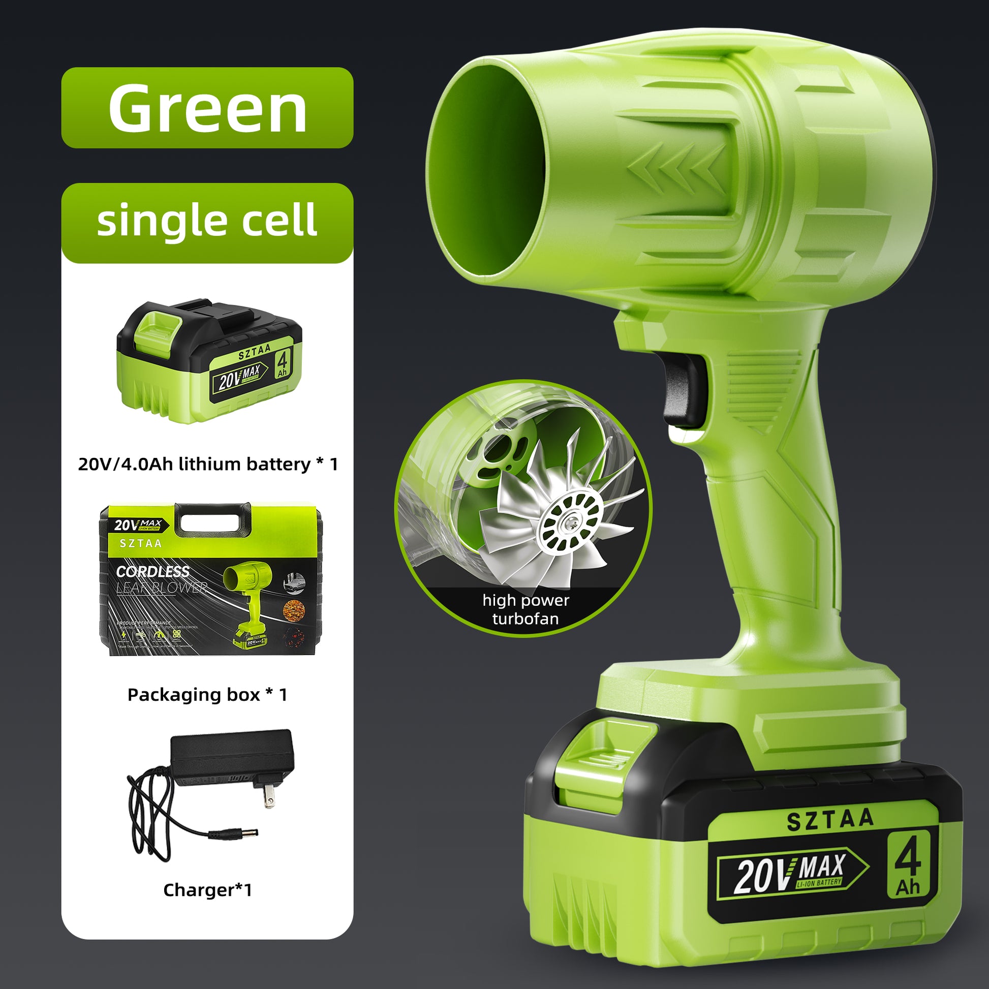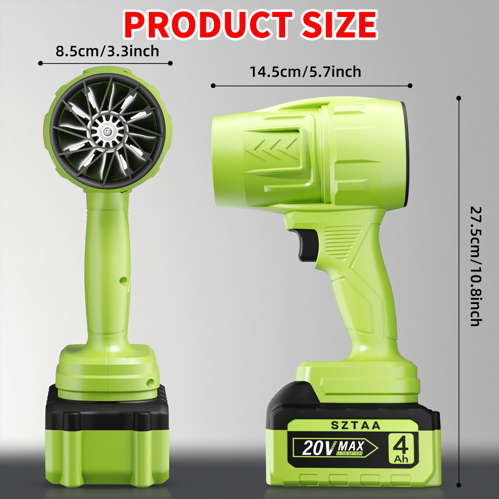 The Cordless Leaf Blower by SZTAA is a modern, handheld leaf blower designed for outdoor use in yards, lawns, and driveways. Powered by a 20V battery, this green plastic blower offers easy start, ergonomic comfort, and lightweight convenience. With adjustable air volume settings and a compact design (10.8 inches in height and 5.7 inches in width), this cordless leaf blower is a practical and efficient tool for keeping outdoor spaces clean and tidy.
